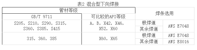 混合型下向焊接是指在長輸管道的現(xiàn)場組焊時,采用纖維素型焊條根焊、熱焊,低氫型焊條填充焊、蓋面焊的手工下向焊接技術(shù)。主要用于焊接鋼管材質(zhì)級別較高的管道。