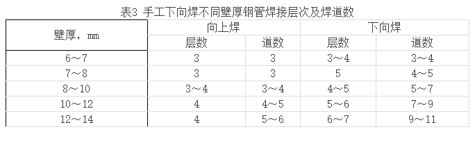 20世紀(jì)90年代末期,大壁厚管材廣泛應(yīng)用國內(nèi)外油、氣和水電工業(yè)長輸管道中,水電工業(yè)的壓力管道中一般管徑達1m以上,壁厚達10~60mm,在我國北方寒冷地區(qū)油氣管道壁厚也達到10~24mm。與傳統(tǒng)的向上焊相比,由于下向焊熱輸入低,熔深較淺,焊肉較薄,隨著鋼管壁厚的增加焊道層數(shù)也迅速增加,焊接時間和勞動強度隨之加大,單純的下向焊難以發(fā)揮其焊接速度快、效率高的特點。手工電弧焊不同壁厚鋼管焊接層次及道數(shù)推參考表見表3。而根焊、熱焊采用向下焊,填充焊與蓋面焊采用向上焊的復(fù)合下向焊技術(shù)則可發(fā)揮兩種焊接方法的優(yōu)勢,達到優(yōu)質(zhì)高效的效果。在半自動氣體保護下向焊接技術(shù)應(yīng)用于管道建設(shè)之前,大壁厚管道多采用復(fù)合型下向焊接技術(shù)。如某工業(yè)園區(qū)輸水管道工程所用鋼管規(guī)格為1400mm×14mm,材質(zhì)為Q235—A。焊接過程中根焊熱焊用纖維素焊條J425G(E6010),填充焊和蓋面焊采用普通E4303焊條,使焊縫焊道層數(shù)由單一下向焊所需的7~8層,減少為4~5層,焊接時間可縮短30min,大大提高了生產(chǎn)效率。