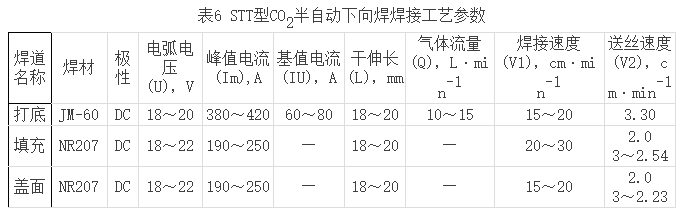 STT型CO2半自動焊以其優(yōu)異的性能拓寬了CO2半自動焊在長輸管道施工中的應(yīng)用領(lǐng)域。中國石油天然氣管道局曾在蘇丹Muglad石油開發(fā)項目中首次使用了STT型CO2半自動下向焊接技術(shù)進行管道打底焊接,中原石油勘探局建筑集團公司正在施工的陜京管線復(fù)線京—石管線工程使用了STT型CO2半自動下向焊接技術(shù),焊接工藝見表6。