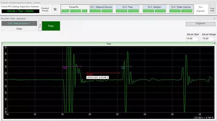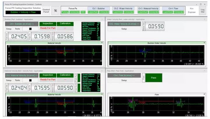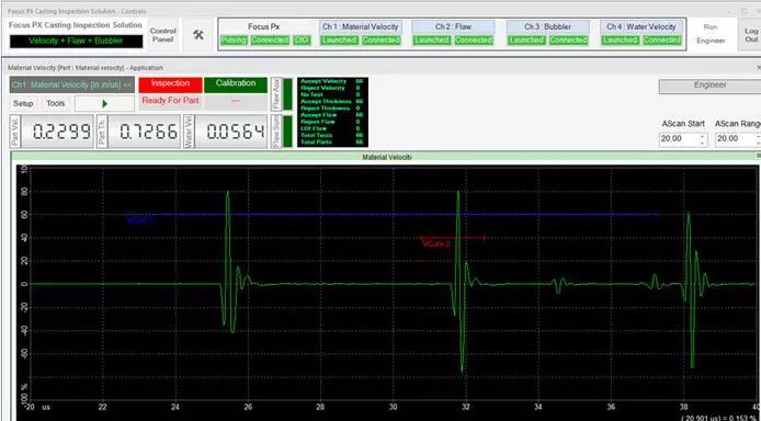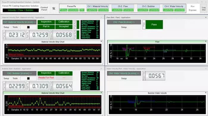 在檢測期間,可以通過用戶界面上的LED屏幕觀察檢測順序。接受/拒絕排序決定也會顯示在LED屏幕上,并在數字輸入/輸出總線上發出信號,顯示每個檢測鑄件的速度數值、厚度和水中聲速測量結果等信息。每個鑄件的測量值都會繪制在趨勢圖上。接受的和拒絕的零件數以及檢測的總零件數由用戶界面上的零件計數器進行計數和顯示。檢測結果最終可導出為CSV文件,用于離線文檔存儲和分析。
