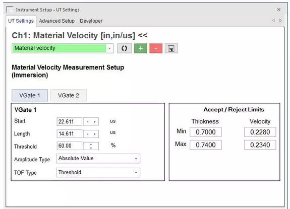 在超聲波檢測系統軟件界面設置檢測樣品的聲速和厚度極限值