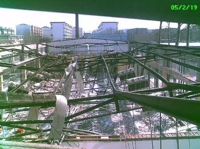 根據建筑鋼結構設計標準,結構體系屬于靜載體系,不考慮疲勞破壞。然而,采用目前的建筑鋼結構設計標準建造高鐵車站時,情況就發生很大的改變:高速列車以300km/h以上的速度通過車站時,車站雨棚立即受到較大的沖擊而產生振蕩;高速列車有規律的24h運營,雨棚也就有規律地產生振蕩。分析認為:雨棚屬于高周低應力疲勞范疇,時間一長,鋼結構主體及圍護結構必然產生疲勞破壞。首先是沒有采用剛性連接的圍護結構接頭松動而發生事故,然后是鋼結構主體產生破壞;如果設計上有不足,施工質量也不好,加上極端天氣因素的疊加,發生質量、安全事故是肯定的。近期出現車站雨棚圍護結構破壞的質量、安全事故印證了這個觀點,如圖11、圖12所示。